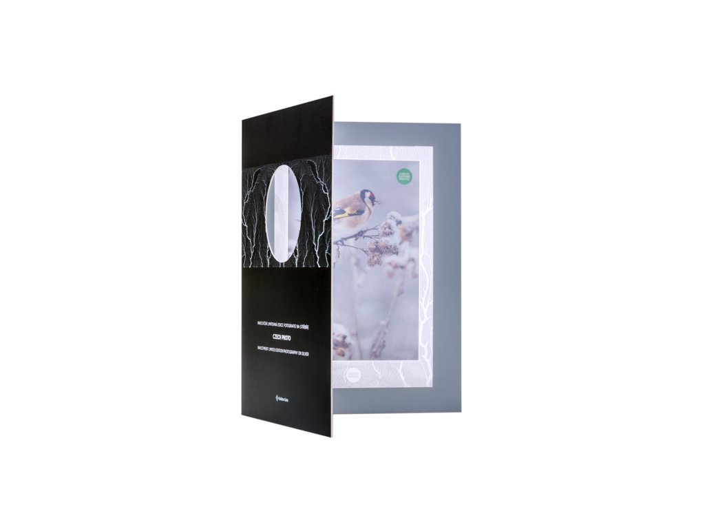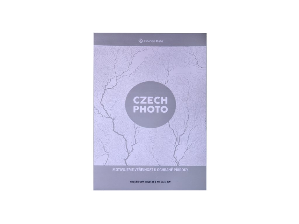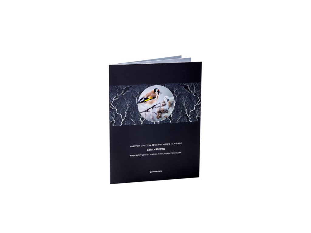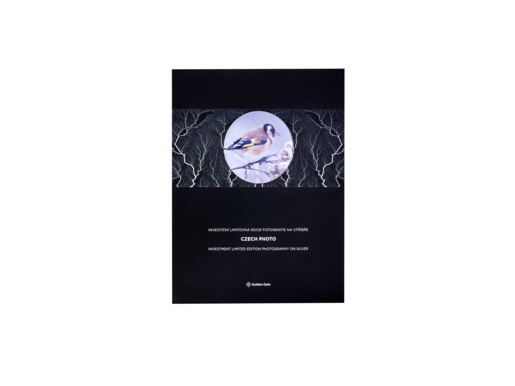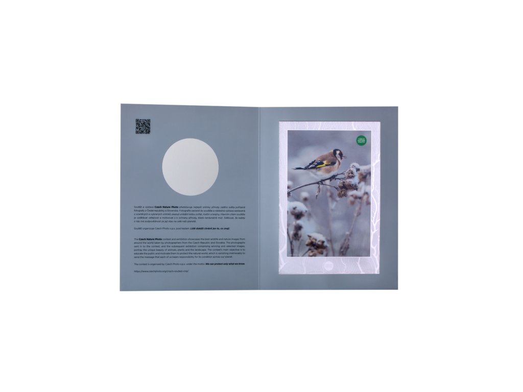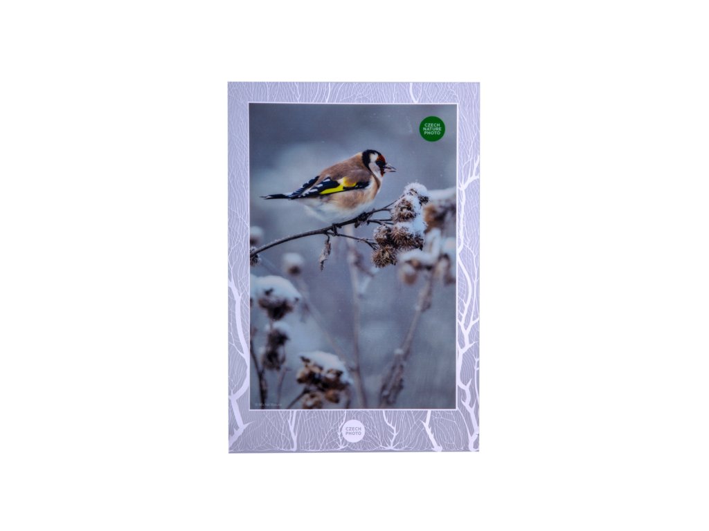 Na přední straně je zachycen stehlík obecný uprostřed zimní krajiny, orámovaný stříbrným okrajem a doplněný logem Czech Nature Photo.