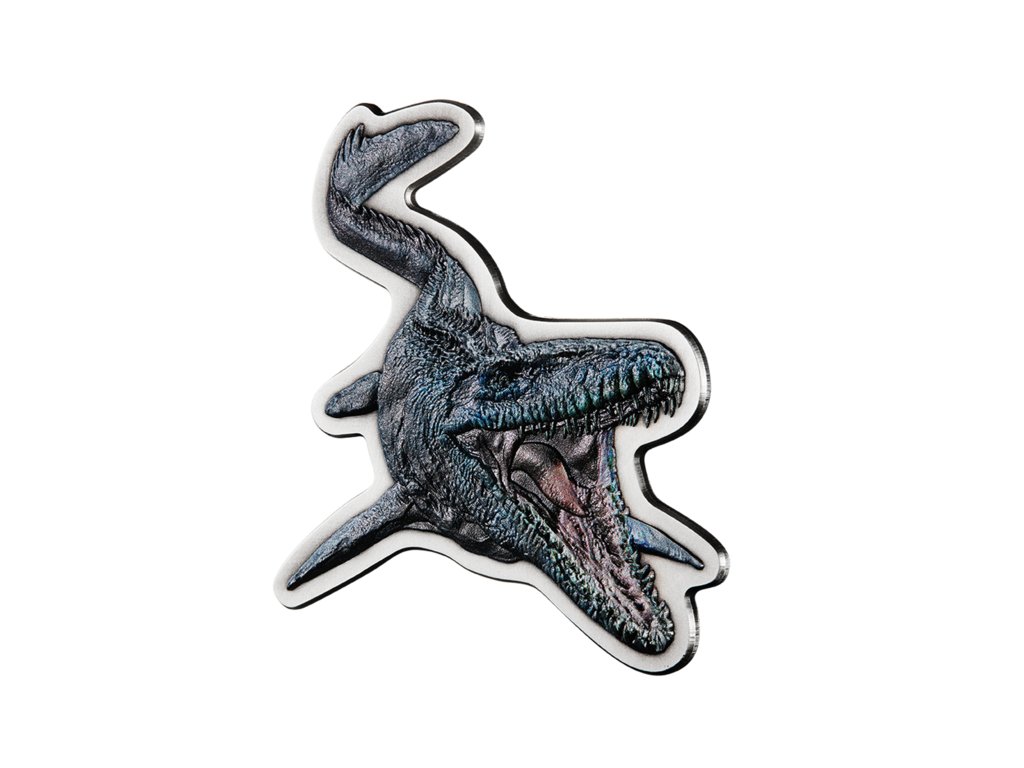 💫 Stříbrná mince Mosasaurus 2 oz Antique Finish – monumentální pocta pravěkým titánům oceánů a dokonalý sběratelský klenot pro fanoušky série Jurassic Park i numismatiky samotné.