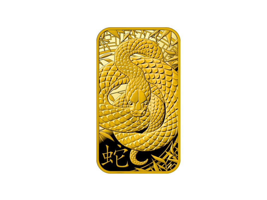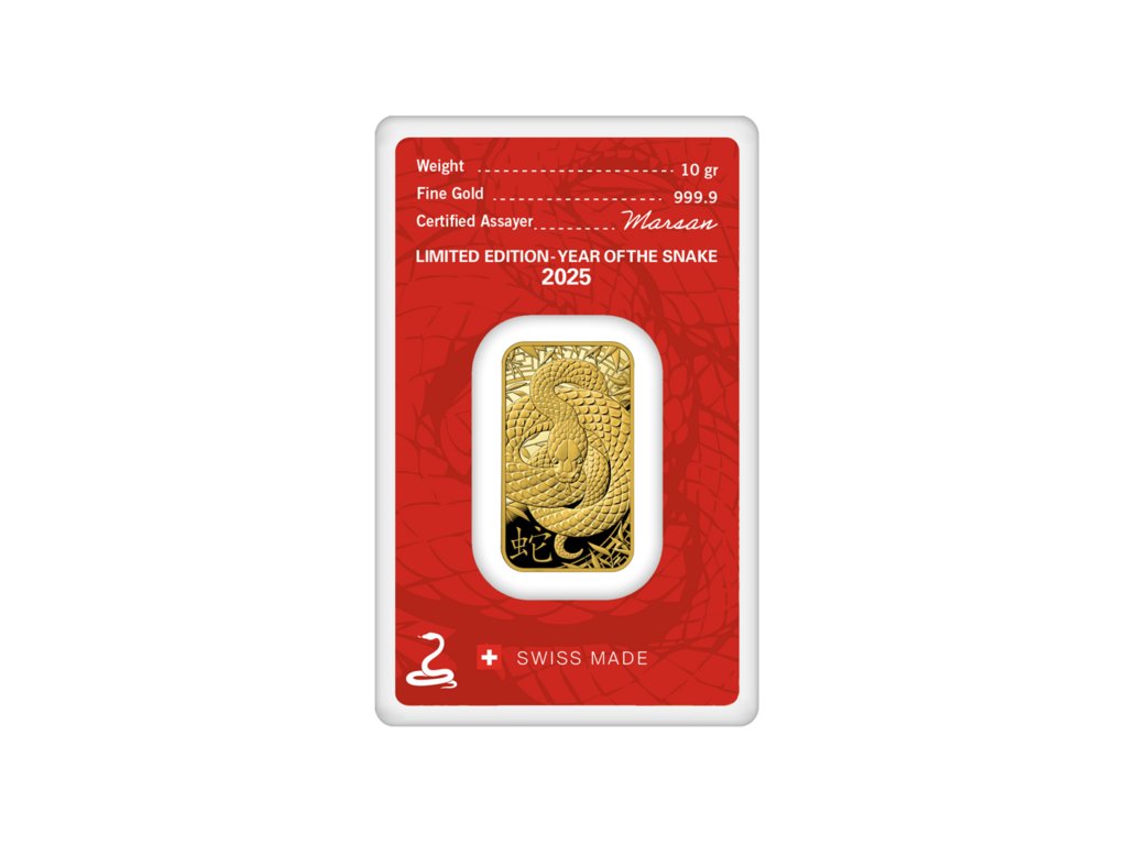 Zlaté slitky jsou vyrobeny z ryzího investičního zlata 999,9/1000 a nesou charakteristický lunární motiv Hada v precizním švýcarském provedení.